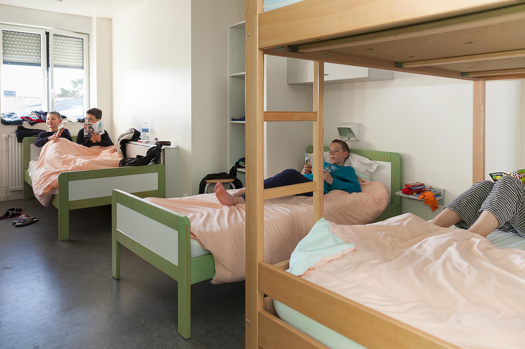 Le matin, ces espaces sont utilisés comme salles de réveil pour le petit déjeuner. Leur proximité avec les chambres permet de commencer la journée en douceur, sans avoir à sortir du bâtiment pour rejoindre le réfectoire, dans une ambiance conviviale.
